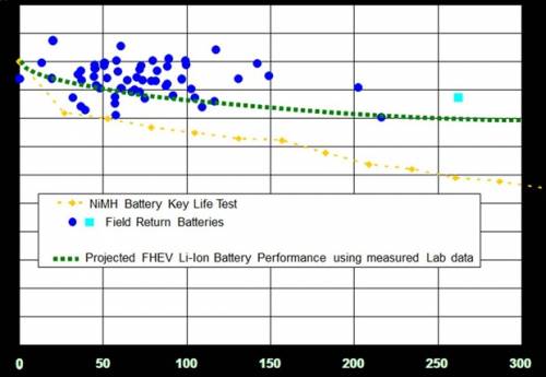 根據福特的調查,購買混合動力車潛在用戶對鋰電池可靠性的要求超過了其他17項因素,而“關鍵壽命試驗”致力于此。福特電動工程師Kevin Layton說:“在我們的測試中,鎳氫電池(福特翼虎混動車中取出的,有一部分已使用了25萬英里)的表現近乎完美。”在2004年推出的翼虎混動曾在 加州組成混動出租車隊,總計已行駛了一億英里。福特之前已銷售了5000萬個電池芯(cell),只有六個出現故障。這樣的低故障率也如實地在這個KLT 試驗中得到了展現。因此,針對該試驗結果,福特電動工程師Kevin Layton說:“我們對鋰鐵電池性能超越鎳氫電池性能很有信心。”測試結果如下圖表,鋰鐵電池的衰減速度比鎳氫電池還要慢20%。