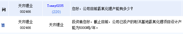 天齊鋰業(yè)(002466)周四在全景網(wǎng)互動(dòng)平臺(tái)表示,截止目前,公司已投產(chǎn)的射洪基地氫氧化鋰項(xiàng)目設(shè)計(jì)產(chǎn)能為5000噸/年。