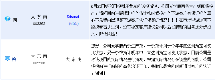 大東南(002263)周三在全景網互動平臺上回答投資者提問時表示,公司兩條光學膜生產線,一條線計劃于今年年底達到預定可使用狀態,另一條線預計明年中下旬達到預定可使用狀態,目前公司正對該項目的實際情況進行預測,根據實際情況存在調整的可能。公司將提前進行前期的商務洽談工作,爭取以最快的時間通過客戶的認證。(全景網)