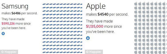 排名榜首的三星公司每秒賺進6486美元(約合人民幣3.95萬元),而蘋果公司則憑借每秒賺進4539美元(約合人民幣2.77萬元)屈居第二,黑莓每秒只有205美元(約合人民幣0.12萬元)的入賬,排名倒數第一。