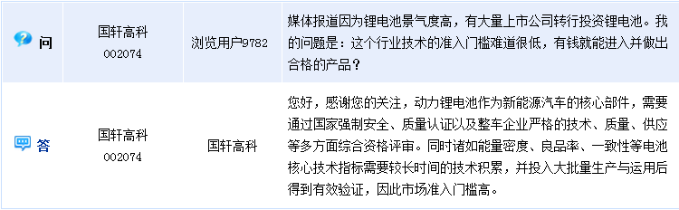 國軒高科(002074)周二在全景網(wǎng)互動(dòng)平臺(tái)上回答投資者提問時(shí)介紹,動(dòng)力鋰電池作為新能源汽車的核心部件,需要通過國家強(qiáng)制安全、質(zhì)量認(rèn)證以及整車企業(yè)嚴(yán)格的技術(shù)、質(zhì)量、供應(yīng)等多方面綜合資格評審。
