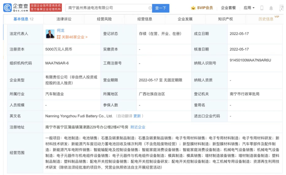 比亞迪在廣西南寧成立動力電池公司 注冊資本5000萬元