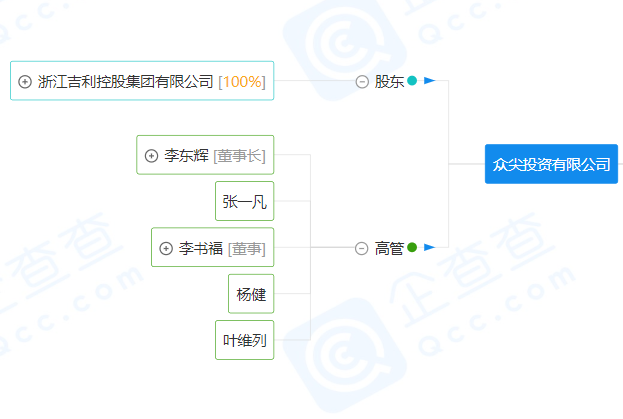 1月21日,由吉利控股集團全資持股的眾尖投資成立,注冊資本5.01億元人民幣,法定代表人為李東輝 ... 查閱全文