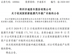 宇通客車2月21日晚公告,公司當日收到鄭州市財政局轉支付的國家新能源汽車推廣補貼款17.17億元, ... 查閱全文