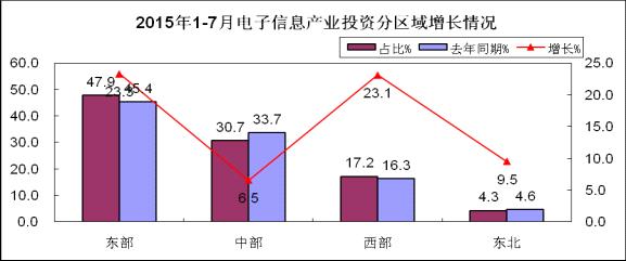 1-7月,東部地區完成投資3553.5億元,同比增長23.3%,比去年同期提高21.1個百分點,高于全國平均水平6.3個百分點,其中北京增長57%,廣東增長44.6%,山東增長31.8%,天津增長15%,上海扭轉負增長態勢,同比增長4.4%。西部地區完成投資1274億元,同比增長23.1%,低于1-6月0.8個百分點,其中四川改變負增長態勢,同比增長0.7%。中部地區完成投資2277億元,同比增長6.5%,高于1-6月1.1個百分點,低于去年同期11.2個百分點,其中湖南投資持續負增長。東北地區完成投資3193億元,同比增長9.5%,低于1-6月13.8個百分點。