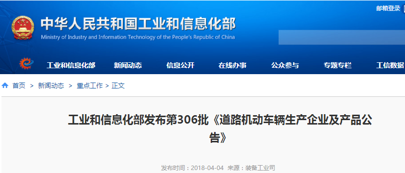 2018年4月4日,工業和信息化部在官方網站發布了第306批《道路機動車輛生產企業及產品公告》。申 ... 查閱全文