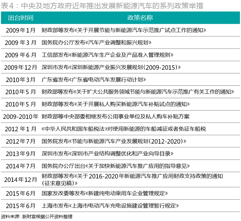 然而,隨著環境污染及能源供應壓力的加劇,電動汽車作為傳統燃油汽車的替代解決方案,越來越受到各級政府的重視。在產業轉型的大勢之下,國家相繼推出發展新能源汽車的系列政策(表4),激活了新能源汽車的廣闊市場空間。新能源汽車成為中國汽車行業發展的新趨勢。