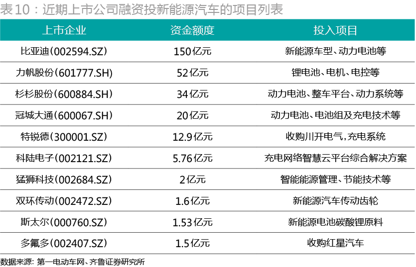 2015年5月以來,10余家上市企業(yè)宣布或者計(jì)劃增加對(duì)新能源汽車產(chǎn)業(yè)的投入(表10)。從新能源汽車領(lǐng)域的產(chǎn)能對(duì)比看,比亞迪已遙遙領(lǐng)先同行,在新能源汽車領(lǐng)域暫無匹敵者。比亞迪稱,今年計(jì)劃銷售新能源汽車6萬-7萬臺(tái),其中K9大巴約5000臺(tái),私家車5萬臺(tái)以上。
