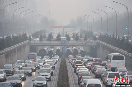 12月16日下午,北京東三環農展橋附近車輛行駛緩慢,霧霾漸濃。中新網記者 金碩 攝