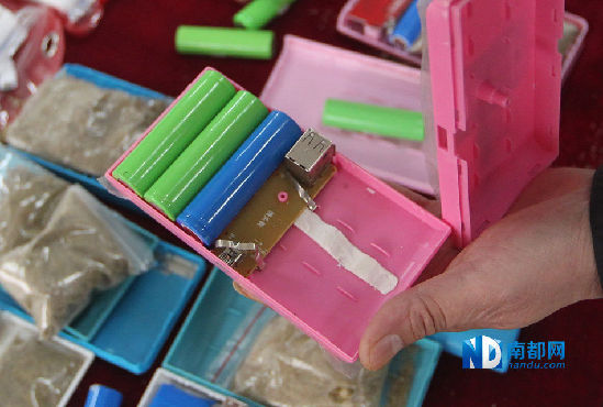 記者拿著這個假充電寶,外殼很光鮮,蓋子上有燈亮著,顯示通電,拿在手上沉甸甸,一切都好像跟正品充電寶無異。但打開蓋子,發現里頭只有一塊電池,僅有一根細電線連接,其他原本是電池的位置是3袋沙子?!八麄冊谀切┥秸瘡S買些充電寶盒子,自己裝個電池,放幾包沙就制成了,手工很簡陋,成本僅要幾元錢?!弊T耀華說,不法分子每個充電寶賣價30元~35元,利潤只有20多元,比賣盒飯要賺多了,“鋪一塊布擺攤就行,逃跑很方便,不容易被抓?!彼硎?,由于假充電寶制作簡陋,多次發生旅客使用一會,里面的電池就爆掉的情況??紤]到通電連接手機,這樣簡陋的裝置安全隱患很大。