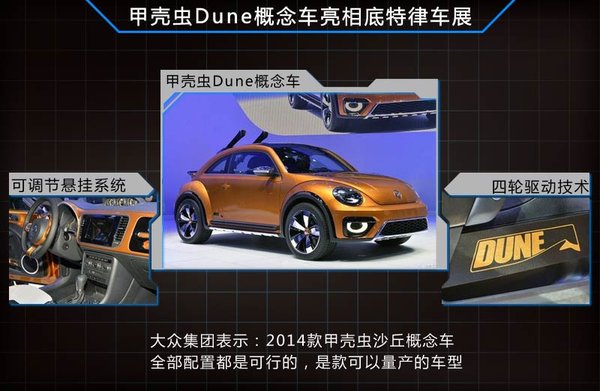 大眾在底特律車展亮相了甲殼蟲Dune(沙丘)第二代概念車,新車除外觀更越野外,對(duì)內(nèi)飾也進(jìn)行了升級(jí),并標(biāo)注了“Dune”的醒目標(biāo)識(shí)。新車還采用了可 調(diào)節(jié)式懸掛系統(tǒng),以應(yīng)對(duì)各種路面情況。動(dòng)力方面,新車將會(huì)搭載一臺(tái)最大功率為155KW的2.0L渦輪增壓發(fā)動(dòng)機(jī),與之匹配的是DSG六擋雙離合變速箱, 其有望在2015年推出量產(chǎn)版本。