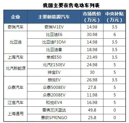如今,進入工信部新能源車目錄的國產車約十幾款,品牌涉及到奇瑞、比亞迪、北汽、 上汽、啟辰、雪佛蘭等。另外,從目前有公布銷量數據看,奇瑞M1 EV、比亞迪F3DM和E6、北汽E150EV、紳寶EV、眾泰朗悅EV、雪佛蘭沃藍達以及賽歐電動等,這些車型在去年的銷量均不超2000輛,其中,比亞迪 EE6、F3DM銷量相對較多,分別為1544輛和1005輛。