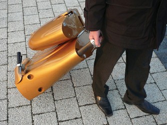 電動自行車由于有笨重的電池而令整車重量比較大,往往不便于攜帶。Moveo也較重,整車有25公斤。但是,它折疊后可以像拉桿箱那樣拖動,就十分方便人們隨身攜帶了。有了這樣的功能,人們可以把它隨意地帶上火車、地鐵,輕松地通過電梯帶入到辦公室或住宅內(nèi)。人們還可以把它裝入到汽車后備箱,在抵達(dá)郊游目的地時啟用Moveo,可以達(dá)到汽車不能達(dá)到的區(qū)域,進(jìn)行靈活自如的“慢游”。