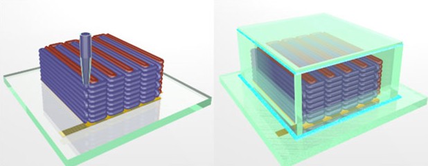 電池的制造工藝非常精細(xì),納米顆粒糊狀物從噴嘴噴出,形成 1 毫米寬的梳狀沉積層。第二個(gè)梳狀沉積層依偎第一個(gè)沉積層,牙齒互鎖——作為導(dǎo)電的兩極。打印后的電極層會(huì)迅速硬化,并放置在一個(gè)特殊的小箱內(nèi)。