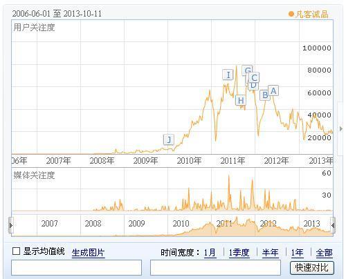 凡客的成功可以說是趕上了好時機,金融危機前融到資,趕上了08年的電商熱潮,又無心插柳的做了凡客體,借助明星效應做得風聲水起。但顯然營銷的老本已經被吃得差不多了。百度指數從高峰時的8萬到現在狂砸廣告都只有2萬,凡客誠品的今天是消費者用腳投票的結果。