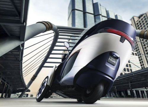 i-ROAD采用傾斜制動器,前懸架上安裝傳動裝置,通過節(jié)叉與左右車輪相連。一個(gè)發(fā)動機(jī)控制裝置根據(jù)轉(zhuǎn)向角度以及陀螺儀和車速信息計(jì)算所要傾斜的角度,讓車輪自動上下移動,利用傾斜角度抵消轉(zhuǎn)彎時(shí)產(chǎn)生的離心力。