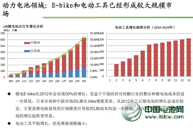 鋰電E-bike在2012年會實現(xiàn)50%的增長,受益于中國政府對鉛酸行業(yè)的整治和鋰電池成本的進(jìn)一步降低,日本市場和中國市場的LIB E-bike增量需求。從2012年之后鋰電池的增長會逐步穩(wěn)定,主要是鋰電批量使用后規(guī)模效應(yīng)導(dǎo)致的LIB成本的進(jìn)一步降低,從區(qū)域市場看:中國的市場的增長趨勢更明顯。 電動工具平穩(wěn)增
