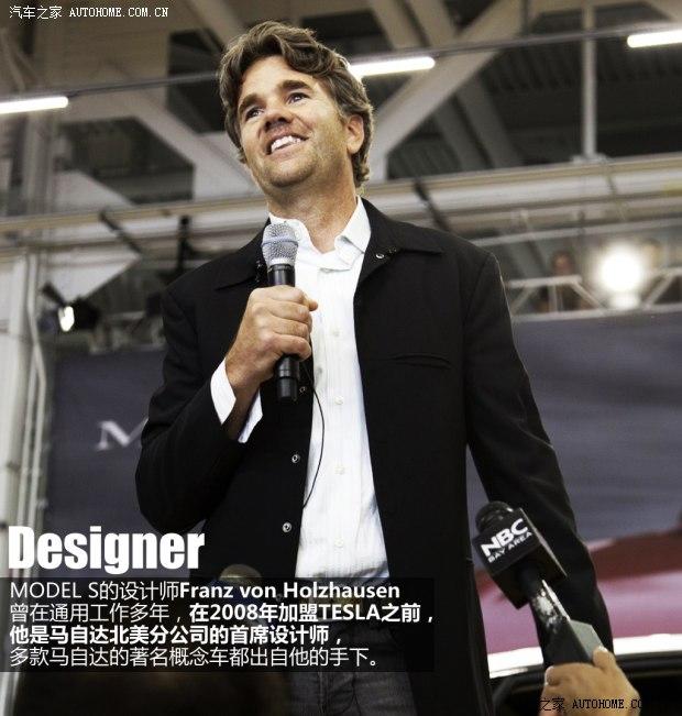 MODEL S的設計師Franz von Holzhausen畢業于加利福尼亞設計學院,是一位年輕的美國本土設計師,曾經在大眾汽車擔任過助理設計師,后又在通用汽車下參與過雪佛蘭SS和龐蒂亞克Solstice等多款通用旗下車型的設計。在2008年加盟TESLA擔任設計主管之前,Franz von Holzhausen則是馬自達北美分公司的首席設計師,馬自達旗下的Furai、Ryuga、Hakaze和Taiki等概念車均出自他的手下。