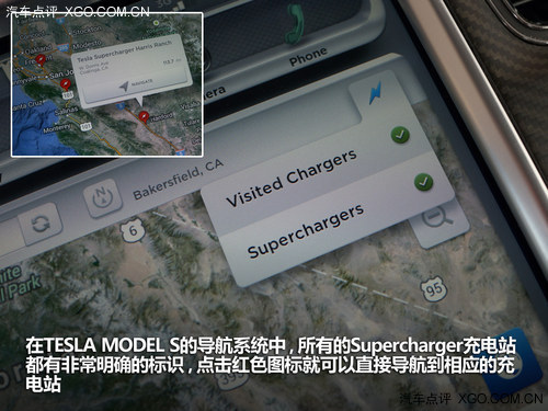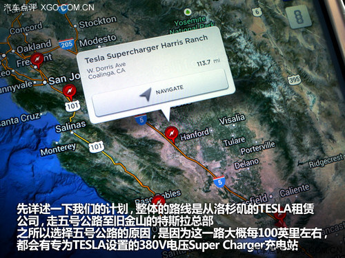 由于TESLA沿著西海岸建立了足夠多的充電站,這也是我們接下來敢從洛杉磯長途奔襲600余公里去舊金山的理論基礎(chǔ)。在TESLA MODEL S的導(dǎo)航系統(tǒng)中,所有的Supercharger充電站都有非常明確的標識,點擊紅色圖標就可以直接導(dǎo)航到相應(yīng)的充電站。