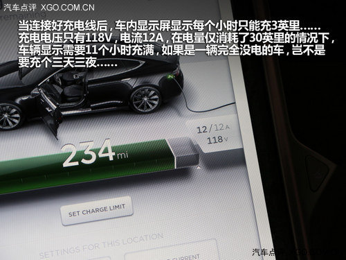 當連接好充電線后,車內(nèi)顯示屏顯示每個小時只能充3英里……充電電壓只有118V,電流12A,在電量僅消耗了30英里的情況下,車輛顯示需要11個小時充滿,如果是一輛完全沒電的車,豈不是要充個三天三夜……