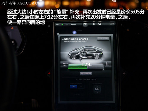 到達第二個充電站時,已經(jīng)是下午4點15分左右,里程剩余127英里(大約204公里),經(jīng)過大約1小時左右的“能量”補充,再次出發(fā)時已經(jīng)是傍晚5:05分左右,之后在晚上7:12分左右,再次補充20分鐘電量,之后,便一路奔向目的地。