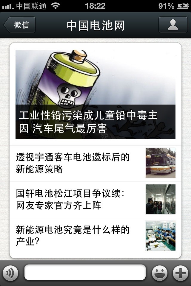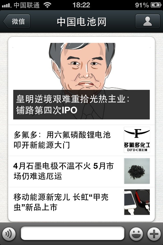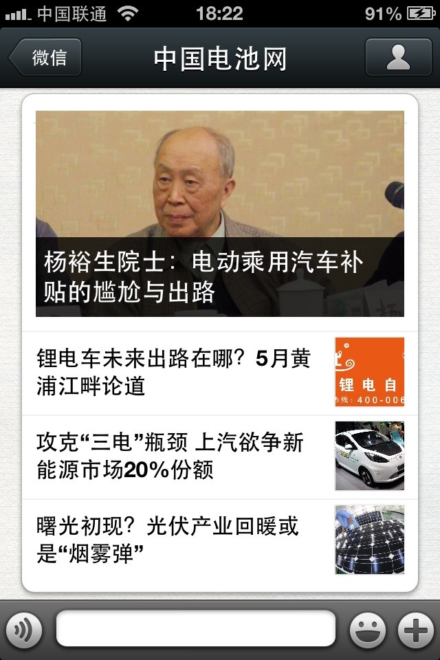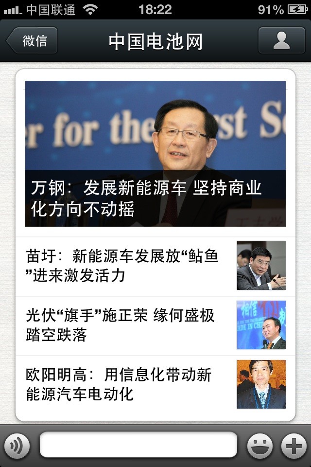 中國電池網的微信(微號:mybattery)已運行有6個月了,半年來機構、企業用戶增加到近兩千,個人用戶也達到一千多,相比于動輒上萬、十幾萬的微號來說,或許微不足道,但對于中國電池網來說卻是彌足珍貴,這些關注我們的用戶95%來自電池行業上中下游、券商機構、VC/PE、能源媒體、國外客戶,是真實的人、熟悉的人!專業度高、粘性強、互動性高。甚至有用戶發來微信,一天不看覺得少了點什么。是的,小微非常榮幸為大家服務,并贏得信任和尊重。小微從中國電池網網站上精選內容推送(有不少是獨家文章),不求最熱但求最有看頭。
