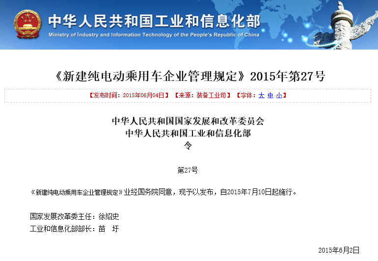 發(fā)改委工信部發(fā)布:新建純電動乘用車企業(yè)管理規(guī)定