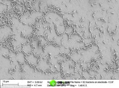 通過顯微鏡看到,海洋細菌希瓦氏菌的合成版本與碳電極發生互動 湯姆-克拉克博士正在東安格利亞大學進行研究的希瓦氏菌 湯姆-克拉克博士正在東安格利亞大學進行研究的希瓦氏菌 生物電池...