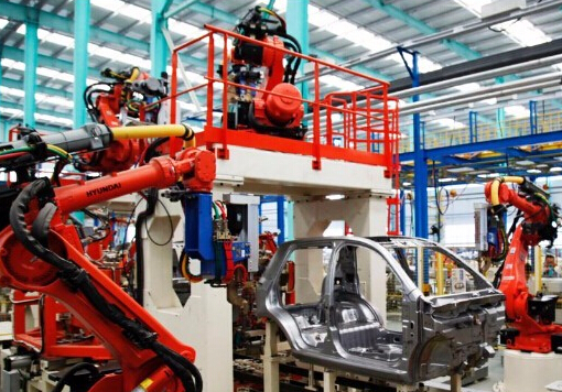 在威海南海新區德瑞博新能源汽車制造有限公司車間內,紅色的工業機器人正在進行沖壓、焊裝、總裝等生產活動,標志著年產15萬輛新能源汽車的生產線正式投產。...