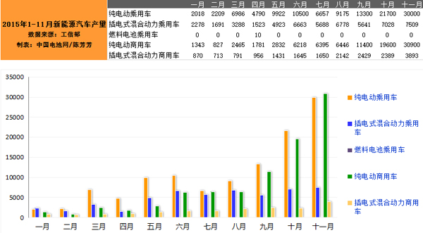 2015年11月,我國新能源汽車生產7.23萬輛,同比增長6倍。其中,純電動乘用車生產3萬輛,同比增長7倍,插電式混合動力乘用車生產7509輛,同比增長2倍;純電動商用車生產3.09萬輛,同比增長18倍。...
