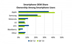 北京時間1月17日凌晨消息,市場研究公司NPD周四公布最新報告稱,2013年第四季度蘋果公司和三星仍是美國智能手機市場上的大贏家。 報告顯示,這一季度iPhone在美國智能手機市場上的占有率為...