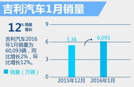 • 吉利汽車:一月份銷量環(huán)比增12% 年內(nèi)推5款全新車 日期:2016-02-05 10:41:54 點(diǎn)擊:343 好評(píng):0