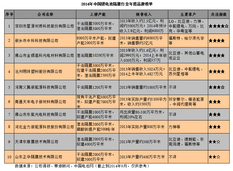 根據我國電池隔膜企業的產能數據、客戶分布、公司情況、誠信形象等得出,數據來源為公司調研和機構數據(數據統計截止到2014年9月,僅供參考)...