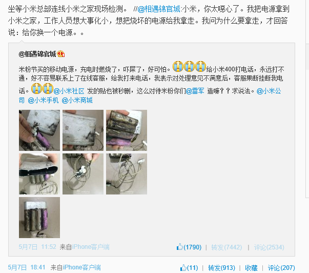 將于下周發布小米3S等新品的小米公司又一次成為微博話題,源于小米移動電源的又一次爆炸事件。微博用戶 @相遇錦官城 稱,米粉節買的移動電源,充電時燃燒了;好不容易聯系上小米客服之后,卻因對處理意見不滿意“電話被掛”,且在小米社區發布的帖子也被秒刪。...
