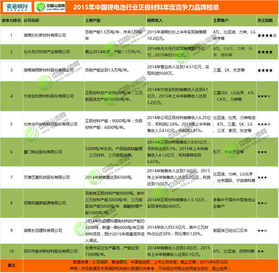 2015年鋰電池行業正極材料年度競爭力品牌榜單
