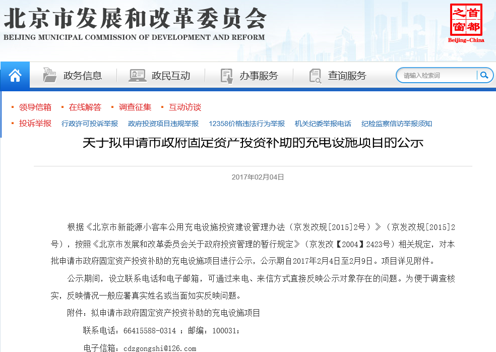 按照《北京市發展和改革委員會關于政府投資管理的暫行規定》(京發改【2004】2423號)相關規定,對本批申請市政府固定資產投資補助的充電設施項目進行公示,公示期自2017年2月4日至2月9日。...